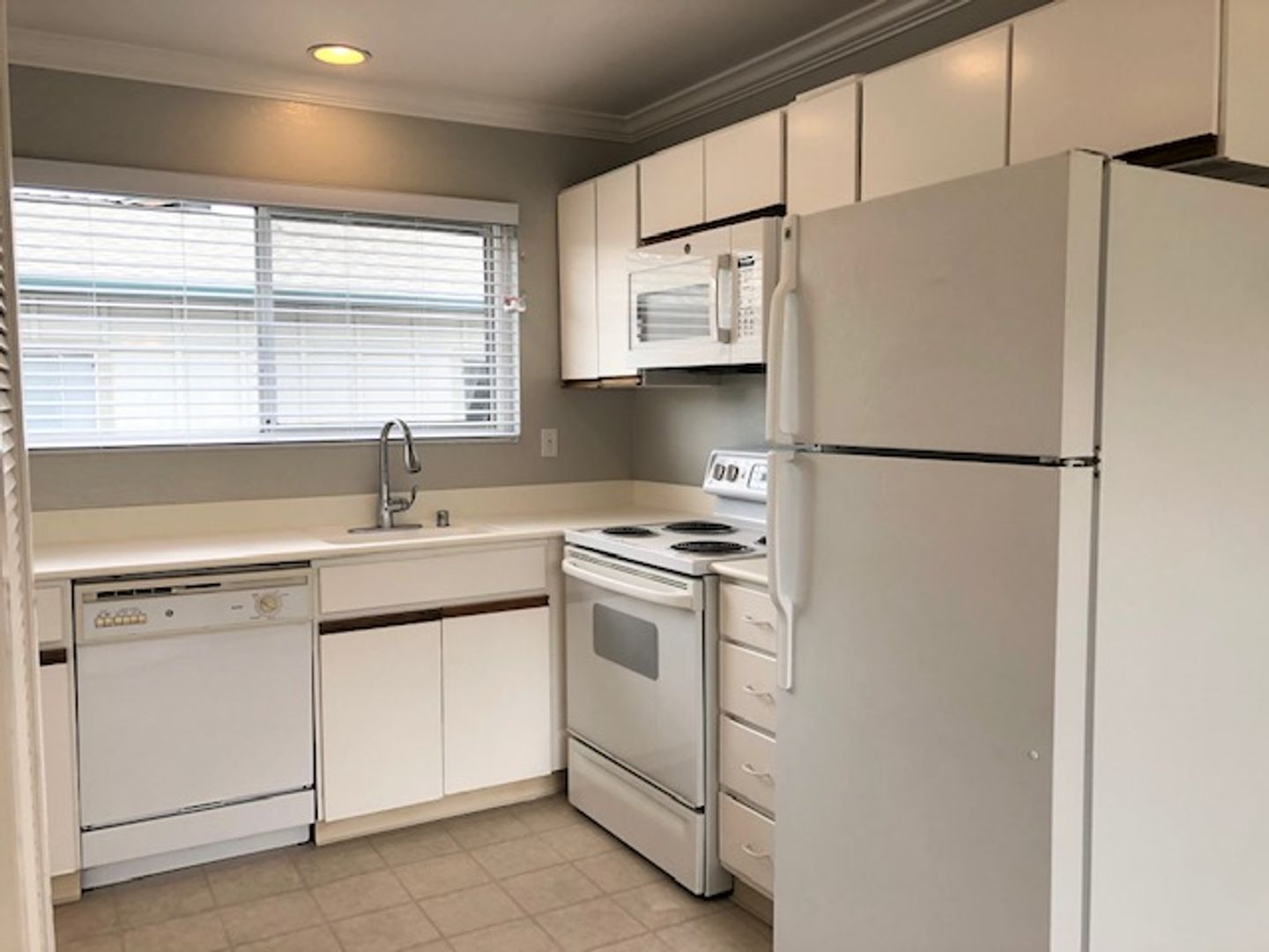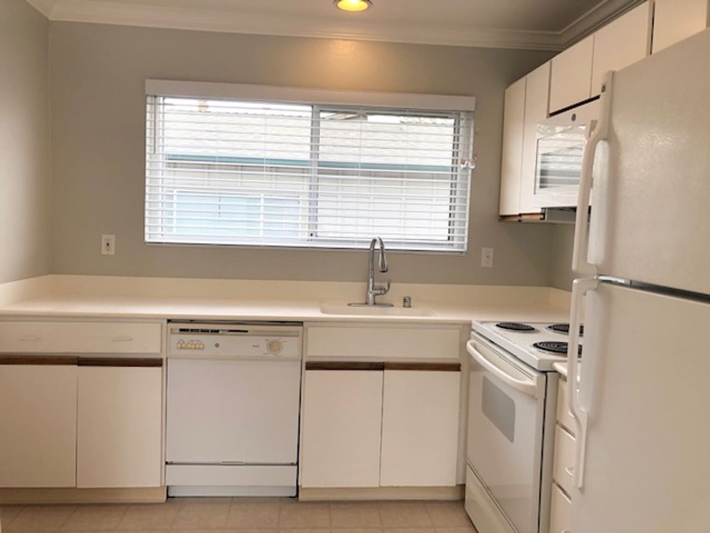 - White appliances: Self cleaning electric range, refrigerator, dishwasher