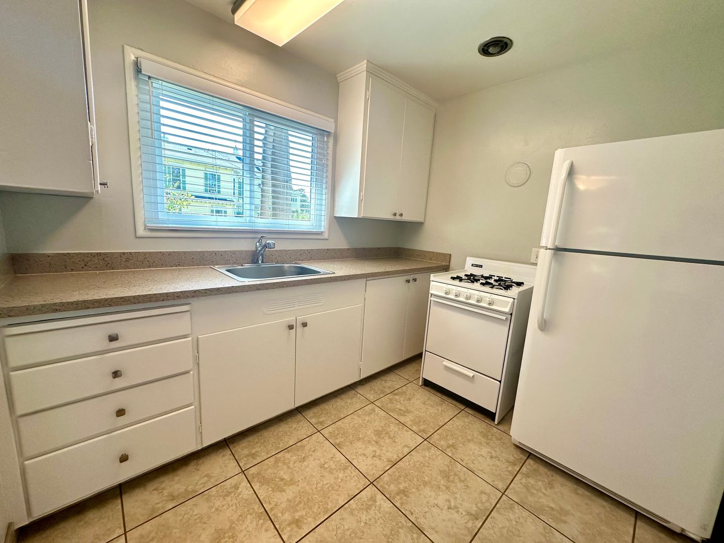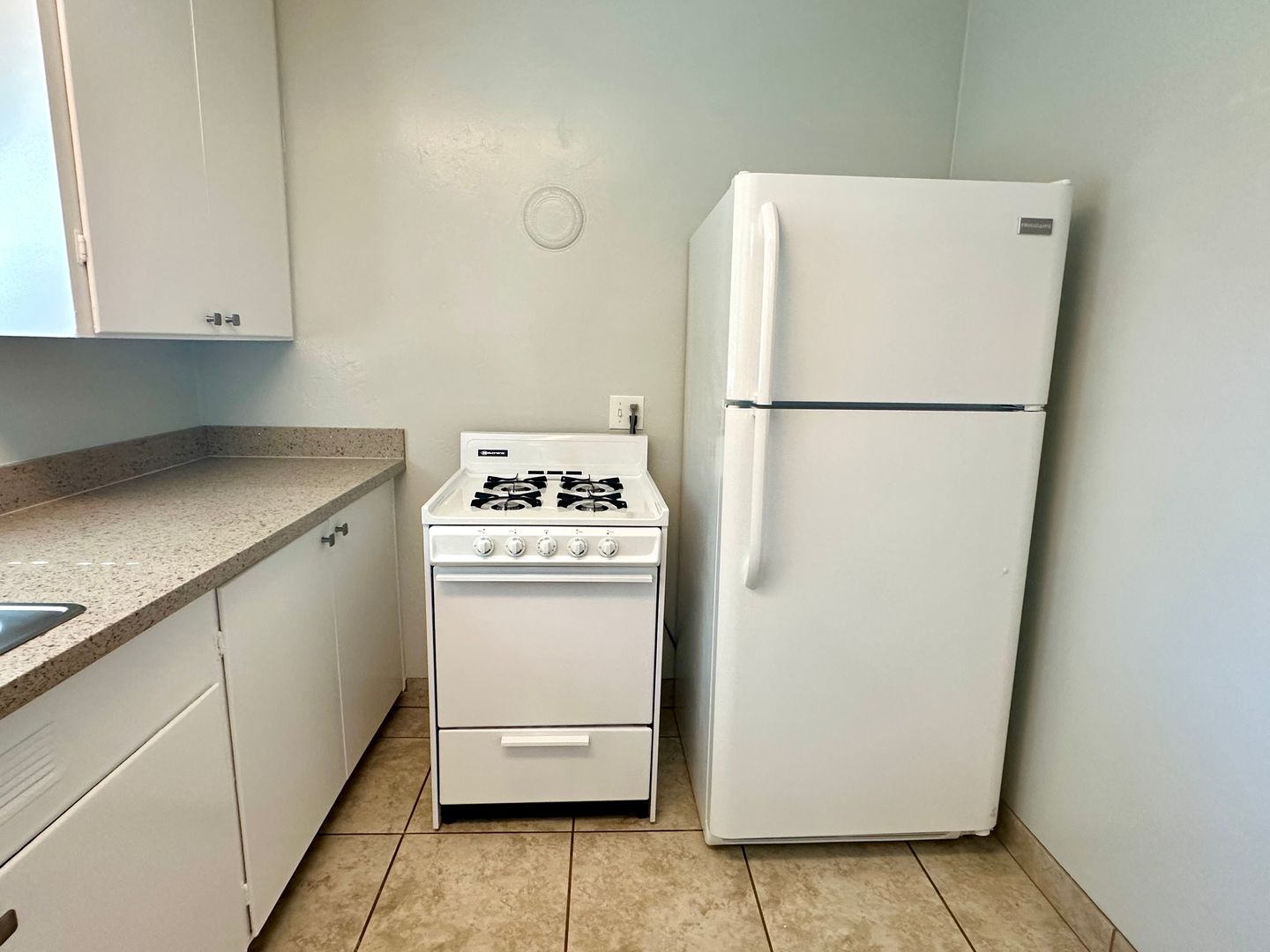 - White appliances: Gas range, refrigerator